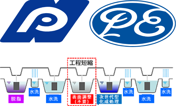 日本パーカライジングとの協力体制により、新型の表調レス設備を万全の体制で提供いたします。 表面調整工程に使用していた薬剤・供給水が不要になるので、ライン長の短縮や、排水処理コストの削減につながります。
