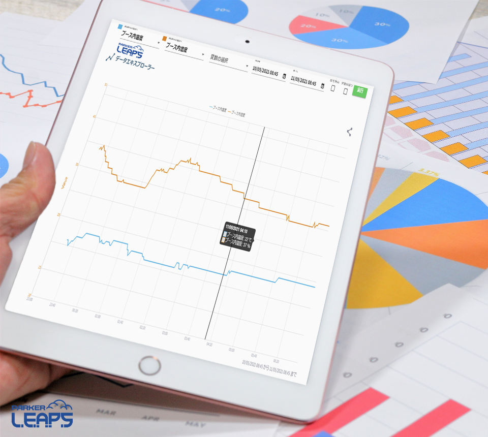 「PARKER LEAPS」は、生産、品質、コスト、環境などの情報を数値化し、設備の状況や課題を直感的に伝えることで業務を効率化するツールです。セキュリティに優れたクラウドネットワークを採用し、スマートデバイスやタブレットで遠隔地からでも設備のさまざまな情報をリアルタイムに確認可能。さらに、クラウドへ収集した点検情報やメンテナンス履歴から、設備の予防保全も効率的に進められます。