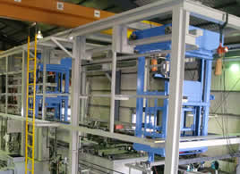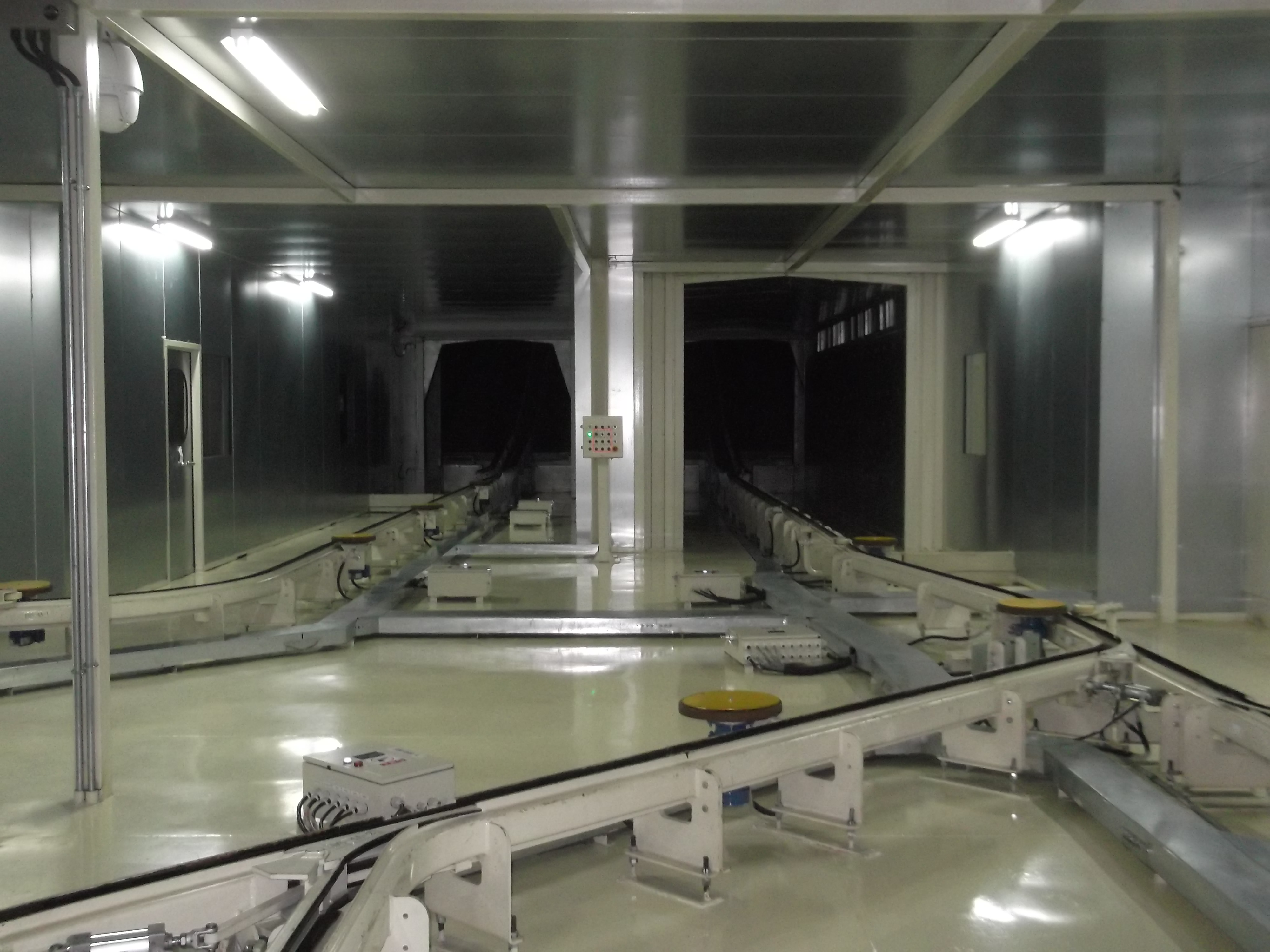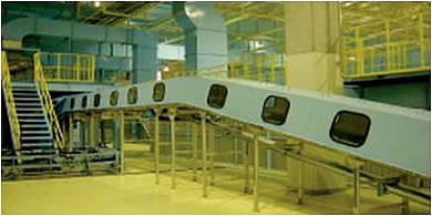 自動車ボディ用のラインでは、パワー&フリーコンベヤを利用した連続ラインや、トラバーサー、ターンテーブルを利用したスキッドコンベヤ、あるいは少量生産のタクト式コンベヤがあります。また、重量のある大型バスボディの場合にもタクト式コンベヤを利用する場合があります。