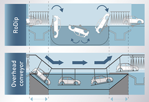 Ecopaint RoDip Eでは、個々のボディ運送に、それぞれプログラミング可能で電力的に独立した搬送ユニットが用いられます。 搬送ユニットは、走行ドライブ及びセパレード式の回転ドライブを備え、配置はパス測定システム経由で行われます。 制御系との通信は、WLAN(無線)信号を使用しています。