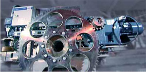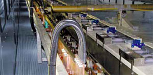 Ecopaint RoDip Mの特徴である両サイドのチェーンドライブが、処理ライン上の回転キャリアを牽引します。 その際、特殊なVカムが、タンク内のキャリアの回転をガイドします。